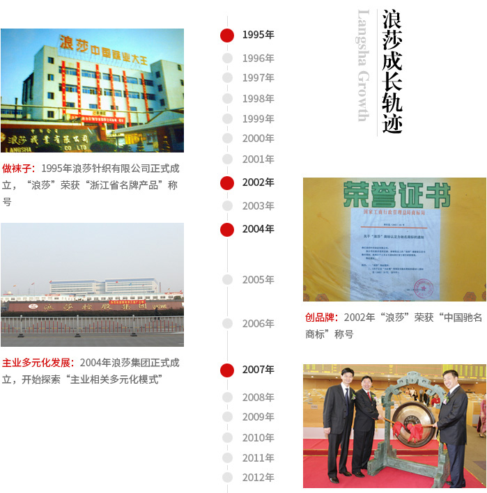 成立于1995年,經過浪莎人三十年不斷的創新、努力,現旗下已擁有宏光針織、立芙紡織、浪莎房地產等多家分公司及四川浪莎、安徽浪莎兩家子公司,成為行業的大品牌廠家。