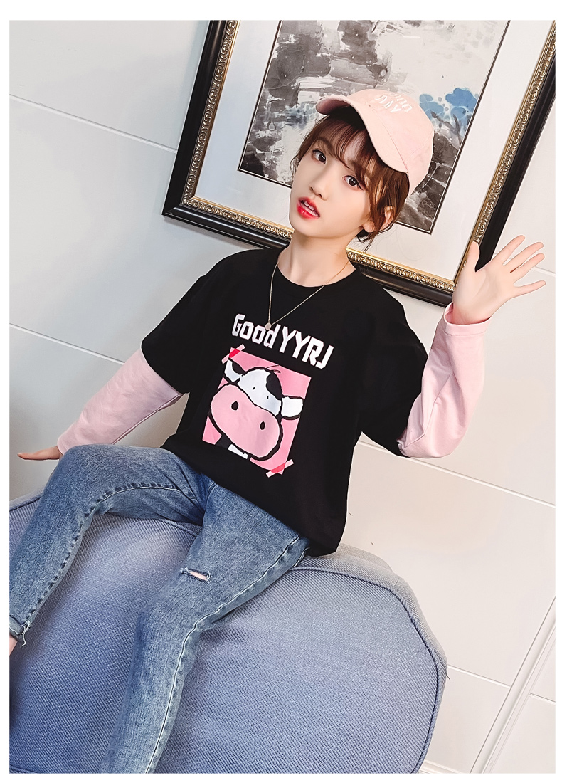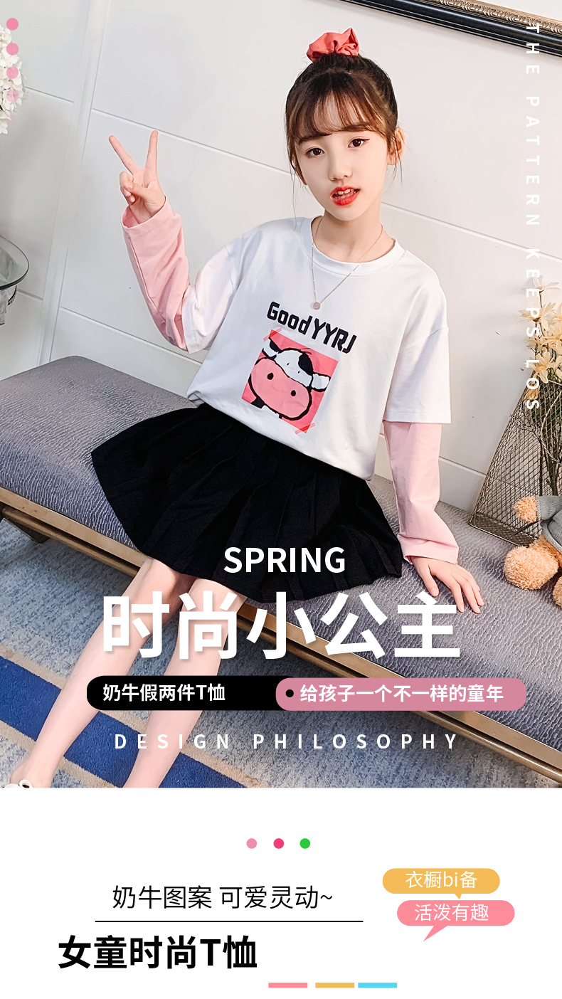 女童春夏2021新款洋氣潮流假兩件白色長袖T恤休閑時髦兒童上衣女